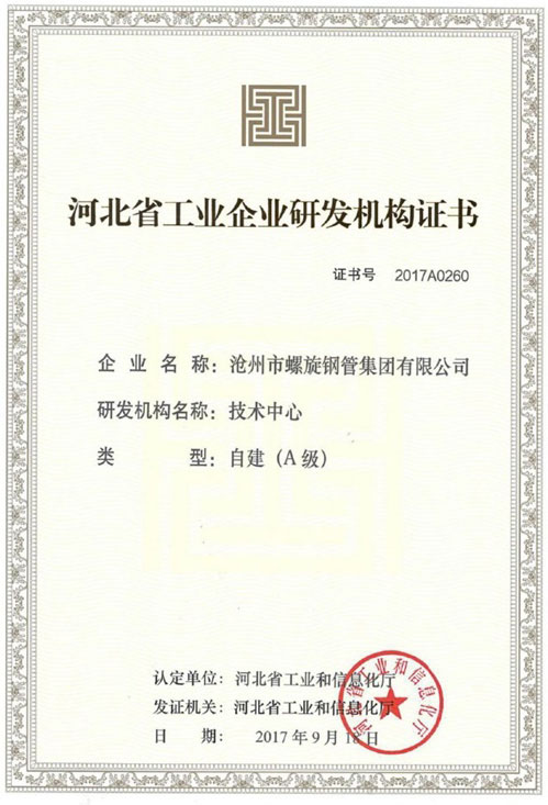 河北省工(gōng)業企業研發機構證書